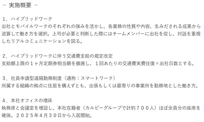 カルビー(東京都千代田区)はアフターコロナによる出社回帰、積極的なリアルコミュニケーションの活用などを踏まえ、「カルビーハイブリッドワーク」へ移行した。勤務場所や時間を自律的に選択できるようにするが、上司が必要とすればチームメンバーに出社を促す。交通費は1カ月定期券相当額を廃止し、出社ごとの往復交通費実費支給に改める。