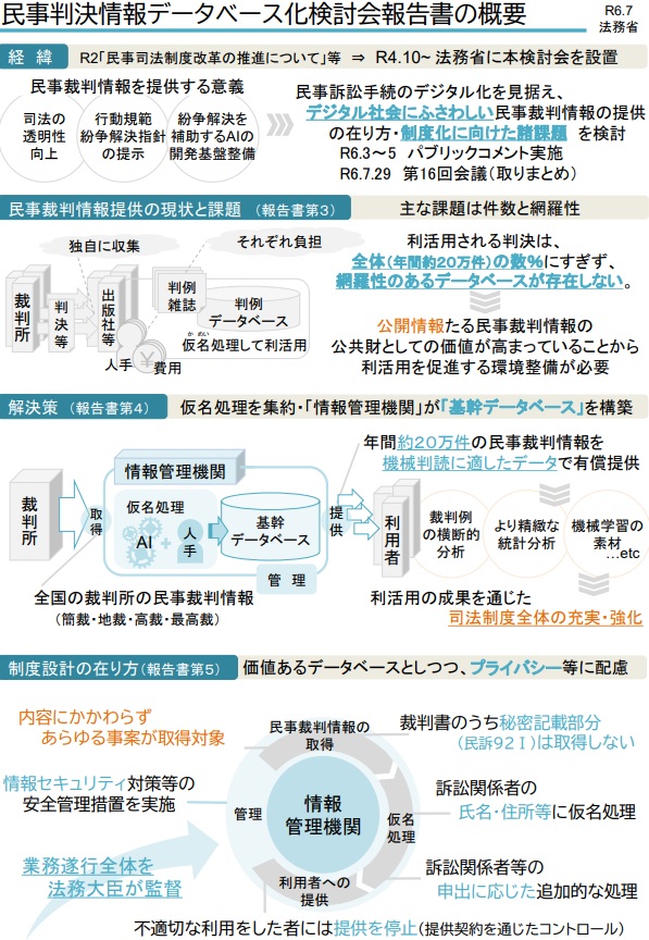 裁判例の横断的な分析や、AIの研究開発への活用などを目的に、公募を経て法務大臣が指定する法人が最高裁判所から提供を受けた裁判情報をDBに収録する。2022年5月に成立した民事訴訟法等改正法によりデジタル化された民事・行政訴訟の判決、判決調書、決定が対象で、これまでの紙媒体で作成された判決などは対象外。プライバシーへの配慮から氏名、生年月日と住所の一部、マイナンバーなどは仮名処理をする。