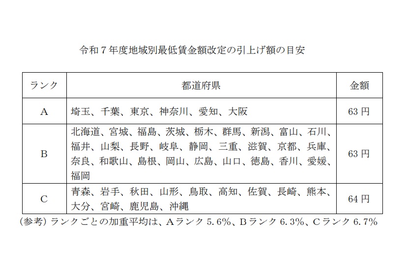 最終的に公益委員見解では、「20年代に全国平均1500円」との政府目標を勘案し、25年度の目安額としてAランクの6都府県とBランクの28道府県に63円、Cランクの13県に64円を提示。下位ランクが上位ランクの目安額を上回るのは初めてで、目安額の全国平均は制度開始以降で最大の63円となった。