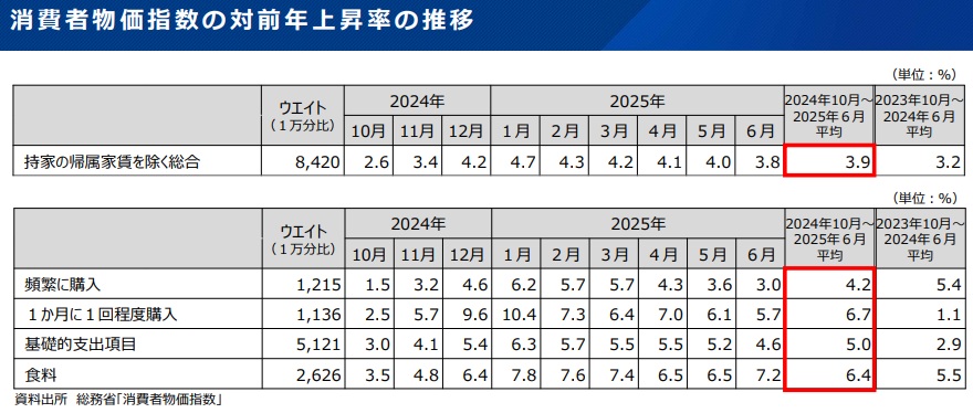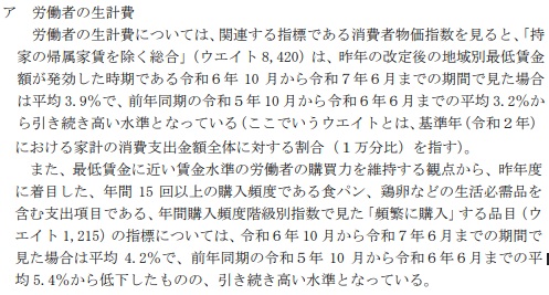 公益委員が目安額を示すに当たって最も重視したのは、法定する賃金改定3要素のうちの「労働者の生計費」だ。消費者物価指数は24年10月から25年6月までの間に、持家の帰属家賃を除く総合が平均3.9%、頻繁に購入する品目や食料、基礎的支出項目、1カ月に1回程度支出する品目といった生活必需品を含むものが平均4.2~6.7%と高い水準で推移していることに着目した。