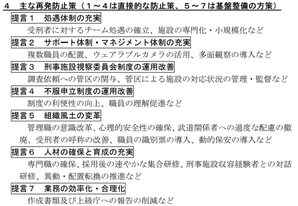 提言では、再発防止に向けた処遇体制や早期発見のための申立制度などの改善策だけでなく、事件が起きる背景となった組織風土の改革や人材確保・育成までを含んだ7つの改善テーマを列挙。