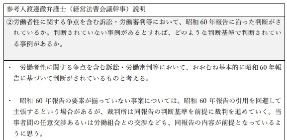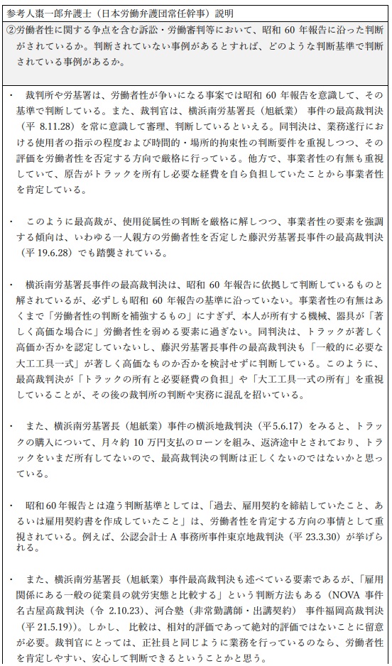 まず労働者性の判断基準について、双方ともに訴訟や労働審判でおおむね参考・判断されていると評価。ただ労働側弁護士は横浜南労基署長事件最高裁判決を念頭に、「労働者性の判断を補強する要素に過ぎない事業者性を強調する傾向」を問題視した。