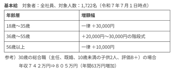 機械工具卸売のトラスコ中山(東京都港区)は7月1日、全従業員の基本給のベースアップを実施した。18~35歳で一律3万円、36~55歳で2~3万円、56歳以上で一律1万円と若年層ほど手厚くし、例えば30歳の総合職の主任で評価がBプラス、10歳未満の子ども2人の場合は年間63万円の増額となる。