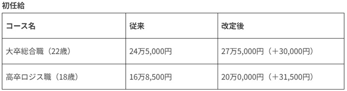 初任給は大卒総合職で27万5千円、勤務地限定で物流業務専任の高卒ロジス職で20万円と順に3万円、3万1500円の引上げを実施。さらに住宅補助手当も、家賃高騰を鑑み全国一律で1万円増額し、改定後の支給額は東京本社勤務で月額9万円、大阪本社勤務で月額6万5千円となる。