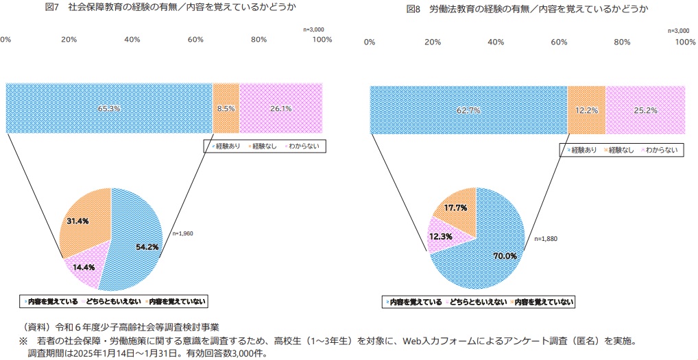アンケート調査によると、社会保障と労働法の「教育の経験がある」高校生の割合が順に65.3%、62.7%にのぼり、うち「内容を覚えている」割合は順に54.2%、70.0%に達した。