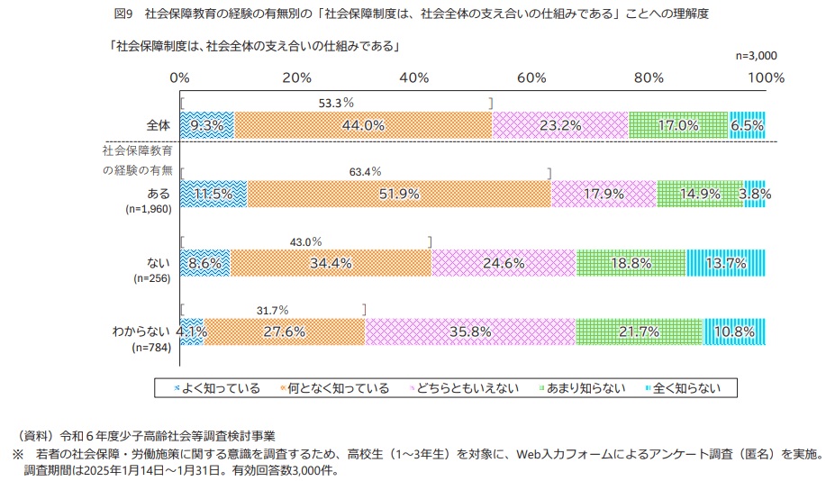 特に社会保障の理念「社会全体の支え合い」を理解している割合は、教育の経験者が63.4%、未経験者が43.0%となるなど教育の効果を示唆した。