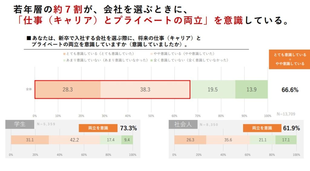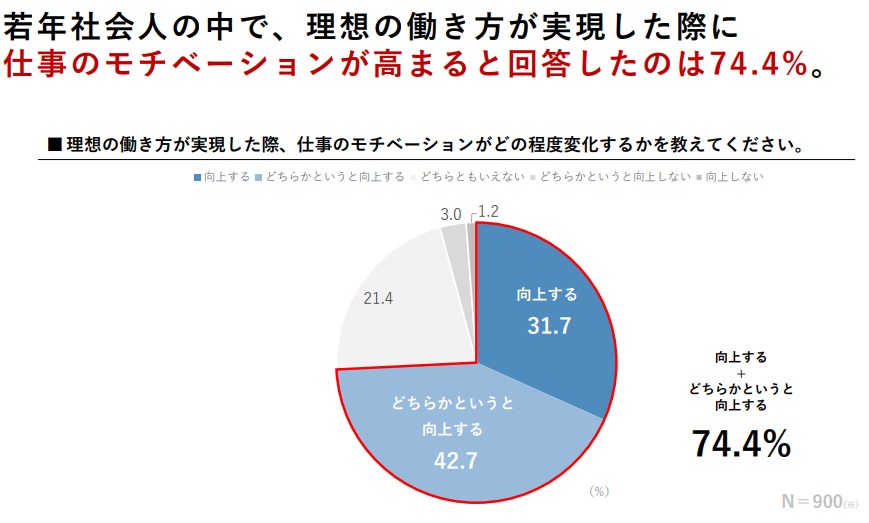 仕事と生活の両立について、66.6%と3人に2人が「会社選びで意識する」とし、理想の働き方が実現すると74.4%が「仕事のモチベーションが向上する」と回答。