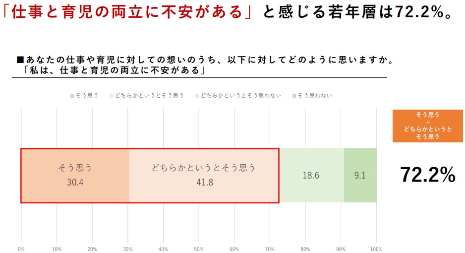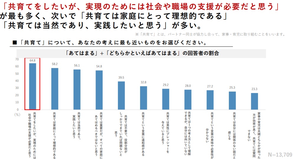 他方で、72.2%は「両立に不安」があり、共育ての考え方としては「実現には社会の職場の支援が必要」が64.8%で最も多かった。
