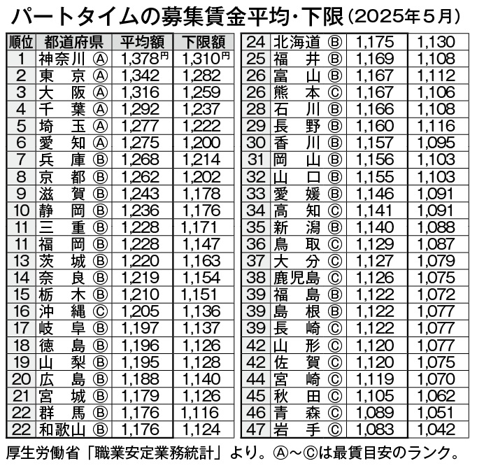 厚生労働省の職業安定業務統計によると、今年5月時点のパートタイム労働者の募集賃金の全国平均額は1235円だった。最高額は神奈川の1378円で以下、東京1342円、大阪1316円と続く。一方、最低額は岩手の1083円で、次いで青森が1089円、秋田が1105円と北東北が占めた。