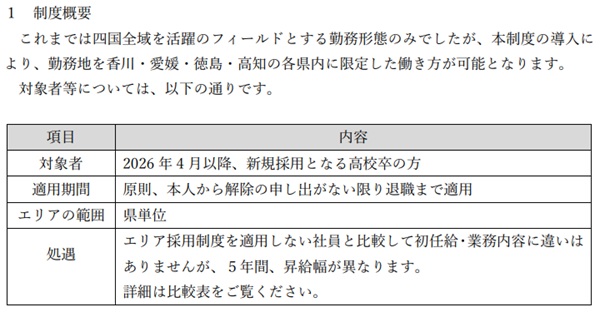 地元で働くことや地域貢献を希望する高校生向けに、香川・愛媛・徳島・高知県単位での勤務に特化した採用枠を新設する。原則として、本人からの解除の申出がない限り退職まで適用。