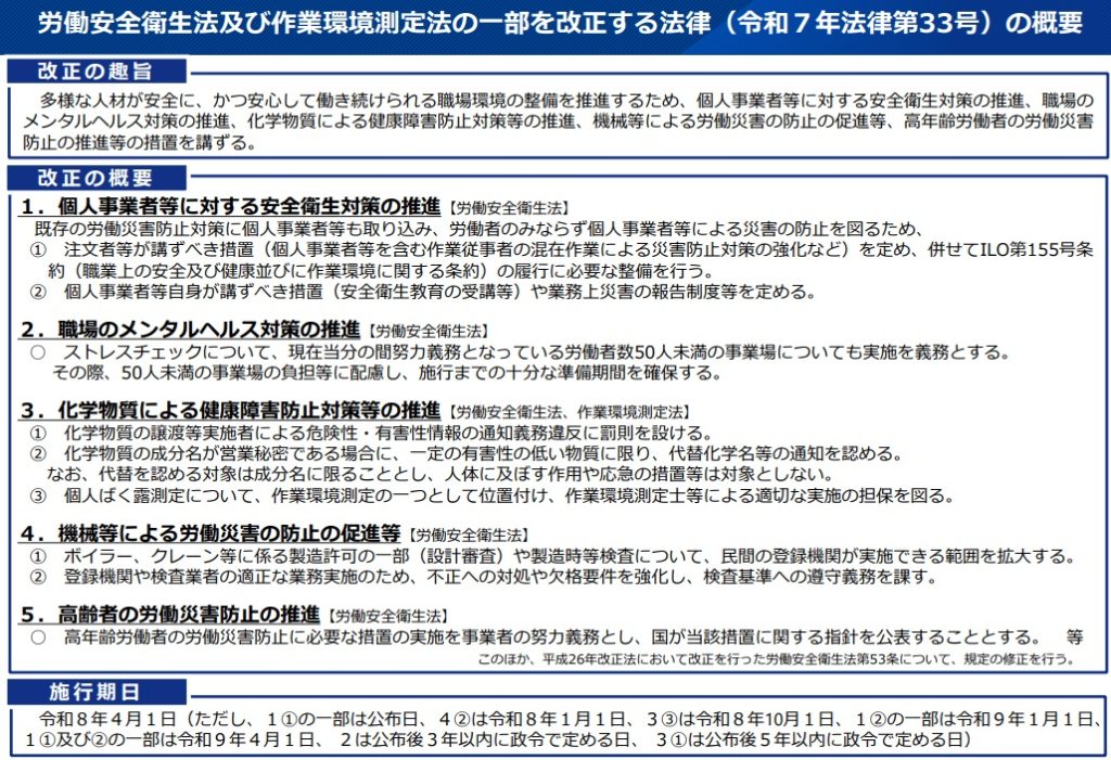 労働安全衛生法は作業環境測定法と一括した改正案が5月8日に成立。5月14日の公布日から最大で5年をかけて順次、施行していく。