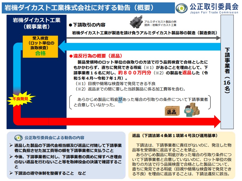 公正取引委員会はこのほど、アルミダイカストの岩機ダイカスト工業(宮城県山元町)を下請代金支払遅延等防止法違反で是正勧告した。