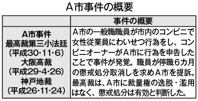 まず取り上げる裁判例はA市事件(最三小判平成30年11月6日)である(表)。A市の一般職に属する男性の地方公務員(一般廃棄物の収集、運搬の業務に従事)Xが、制服を着用して頻繁に利用していたA市内のコンビニエンスストアで、かねてから女性従業員を不快にさせる不適切な言動をしていたなかで、勤務時間中に店内で女性従業員にわいせつな行為(本件行為)をしたことを理由に、停職6カ月の懲戒処分をA市から受けた。この処分は重きに失するもので違法であるとして、A市に対し処分の取消を求めたものである。