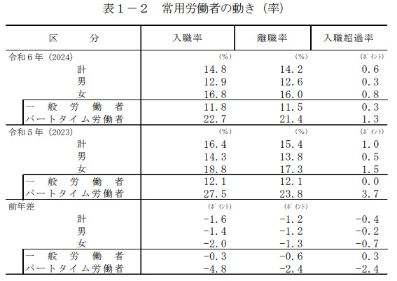 このほか、入職率が同1.6㌽減の14.8%、離職率が同1.2㌽減の14.2%とともに低下。好景気を示す入職超過率は4年連続でプラスとなったが、同0.4㌽減の0.6㌽と縮小した。
