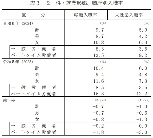 転職入職率も、同0.7㌽減の9.7%と3年ぶりに低下。特に女性が同0.8㌽減、パート労働者が同1.8㌽減と減少幅が大きかった。