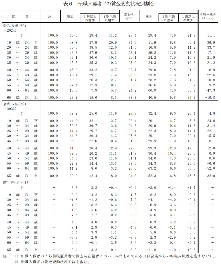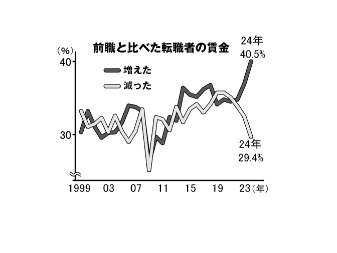 厚生労働省がこのほど発表した2024年雇用動向調査で、前職より賃金が増加した転職入職者の割合が前年比3.3㌽増の40.5%と最高を更新し、初めて4割を超えた。一方、賃金が減少した割合は、同3.0㌽減の29.4%と15年ぶりに2割台に低下。増加と低下の差が10㌽以上開くのも初で、中途採用でも人材獲得競争が激化する実態を鮮明にした(図)。