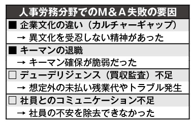 前述の事例は、どこに問題があったのでしょうか。主たる要因は、統合後を見据えた「カルチャーギャップ対策」と「キーマン確保」の不足にあります(下表参照)。