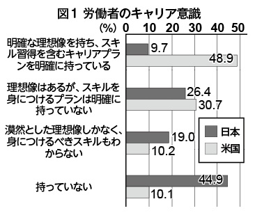 労働者への調査結果では、スキル習得の意欲やキャリア意識で日米に大きな差が現れた。「身につけたいスキルの数」の設問に「ゼロ」と回答した割合は、日本の労働者が36.3%にのぼるのに対して米国の労働者は6.2%。また「明確なキャリア理想像とそれに向けたプラン」を「持っている」割合は日本が9.7%に対して米国が48.9%だった(図1)。キャリアプランが明確である労働者ほど身につけたいスキル数が多く、両者は相関関係があった。