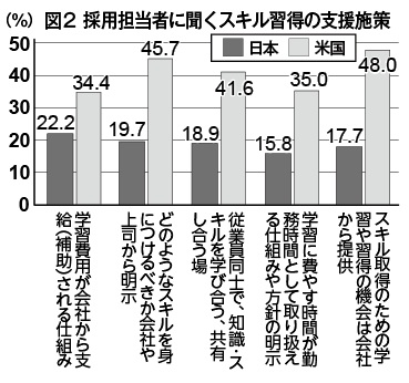 一方、採用担当者に自社のスキル習得への取組みを尋ねた設問では、「従業員が身につけるべきスキルは会社や上司から明示される」との回答は日本で19.7%、米国で45.7%だった(図2)。また「会社から学習や習得機会の提供がある」は日本で17.7%に対し米国で48.0%となるなど、会社側へのスキル習得支援策の設問でも日米で大きな差が見られた。