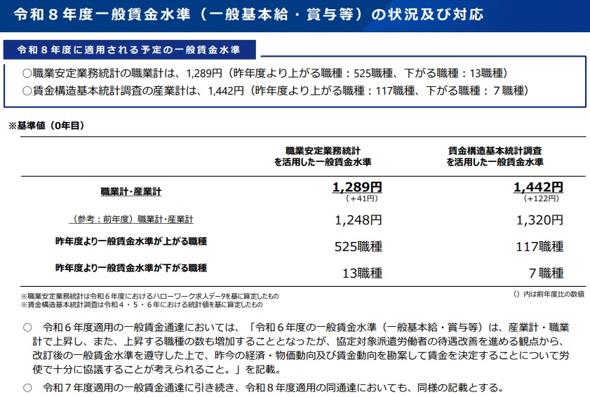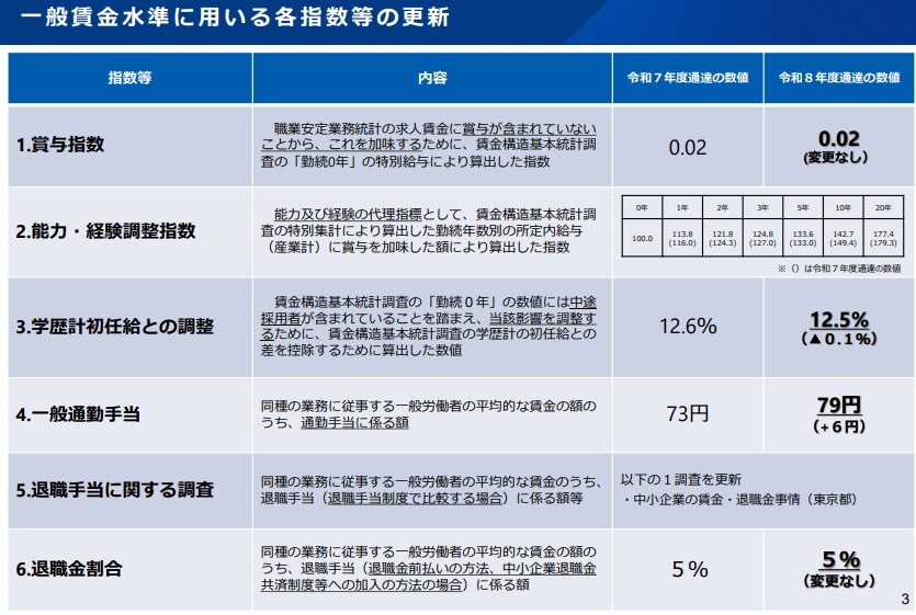 来年度から適用する一般賃金水準は、職業安定業務統計の職業計で前年度比41円増の1289円、賃金構造基本統計調査の産業計で同122円増の1442円とともに上昇。賞与指数は0.02、退職金割合は5%と変化はないが、一般通勤手当を同6円増の79円へと引き上げる。