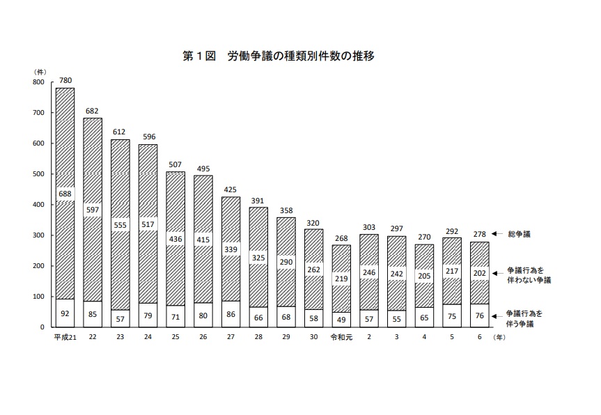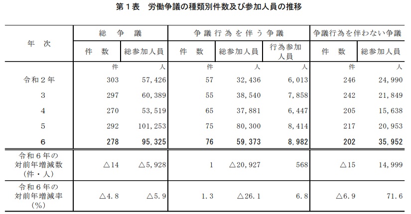 2024年の総争議件数が前年比14件減の278件と2年ぶりに減少したことが、このほど厚生労働省の労働争議統計調査でわかった。うち争議行為「あり」が同1件増の76件に微増したが、「なし」が同15件減の202件に減った。