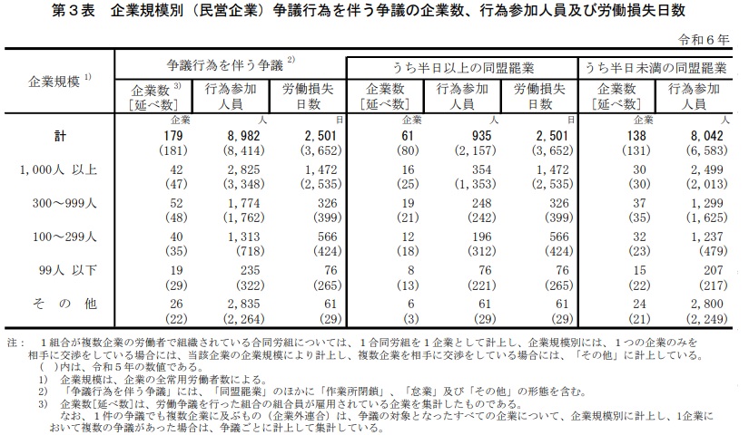 民営企業の争議行為を伴う争議の延べ数は同2社減の179社に減り、規模別では「300~999人」が同4社増の52社で最多。ストライキは「半日以上」が同19社減の61社と減る一方、「半日未満」が同7社増の138社に増えた。