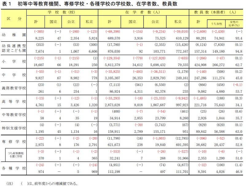 このほかの学校の女性教員も、増加の一途を辿っている。女性教員の割合をみると、中学校で同0.2㌽増の45.0%、高等学校が同0.3㌽増の34.1%、特別支援学校で同0.1㌽増の63.0%といずれも最高値を記録している。