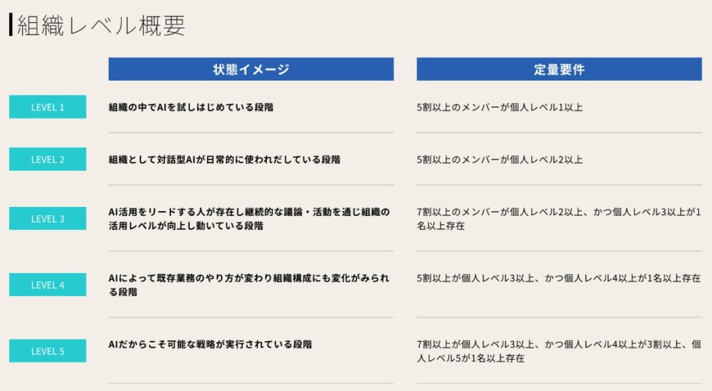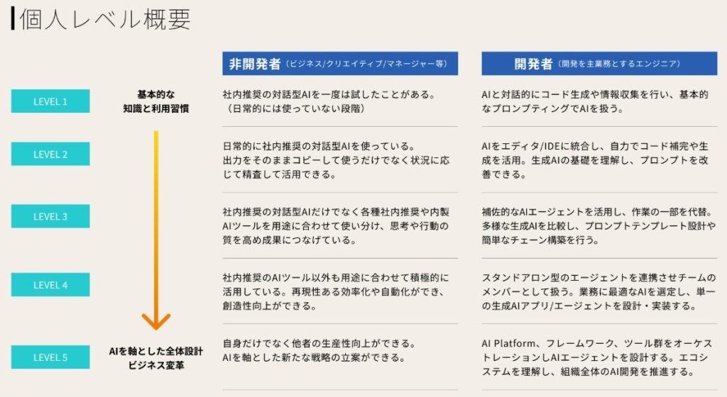 DARSは個人レベルと、部署・チーム単位の組織レベルの二つの側面で、AI活用のレベルを半期の評価サイクルごとに可視化する。例えば個人レベルでは開発者と非開発者に区分し、AI活用の習熟度に応じてレベル1~5までの段階を設定。なお可視化した指標は個人の人事評価には直結させず、期待される役割・成果を明確化するための等級の推奨要素として用い、半期ごとの目標設定に反映させる。他方で、組織レベルも5段階の指標を設定しており、今年度末までに全組織でレベル2に到達することを目標に掲げている。