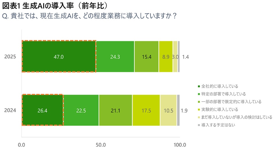 プライム市場に所属する売上1千億円以上の企業の部長クラス以上700人から回答を得たデロイトトーマツグループの調査によると、生成AIの導入率は95.6%に達した。前年比8.0㌽増と上昇し、特に「全社的に導入している」割合が同20.6㌽増の47.0%に急増している。