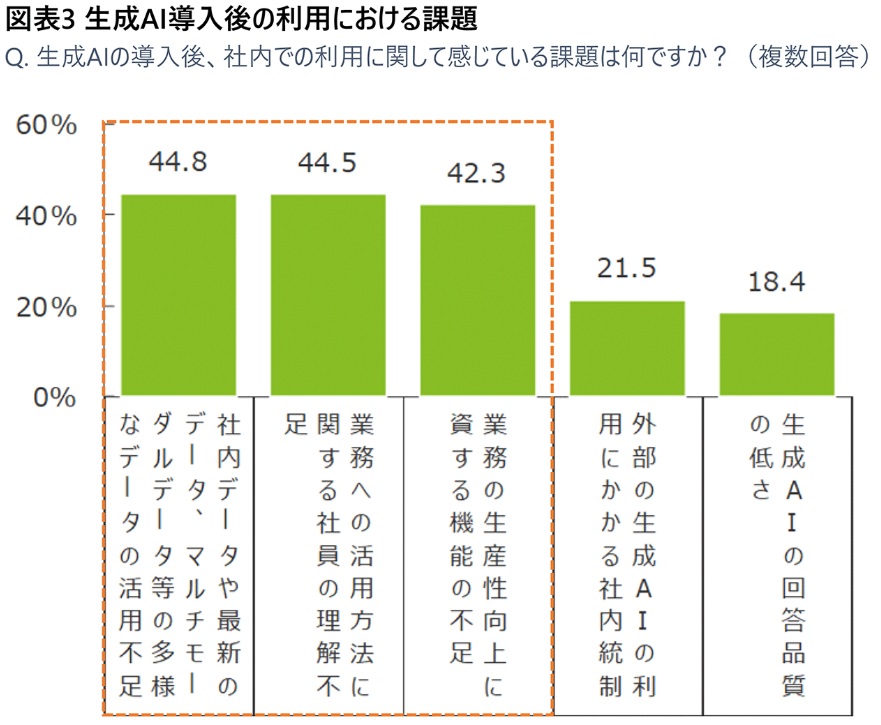 有益性を認めて、大企業が生成AIの導入を急いでいるが、社内に浸透しているとまでは言い切れないようだ。生成AIの利用度合いを問うと、「ほとんどの社員が利用している」は18.5%にとどまり、「半数以上の社員が利用している」の32.9%と合わせて、5割を超えるというのが実態。生成AI利用の課題としては、「活用不足」「理解不足」「機能の不足」の3つの不足を指摘する声が多かった。