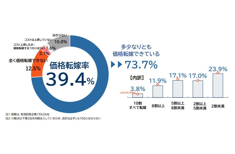 帝国データバンクがこのほど発表した価格転嫁に関する実態調査で、自社の商品・サービスのコスト上昇分を「多少なりとも価格転嫁できている」割合が2月の前回調査比3.3㌽減の73.7%へと低下した。