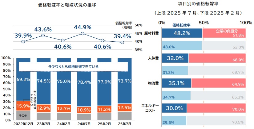 コスト上昇分に対する販売価格の転嫁度合いを示す価格転嫁率は同1.2㌽減の39.4%に低下し、約2年半ぶりに4割を下回った。コスト別では「原材料費」こそ48.2%と5割に迫るが、「物流費」は35.1%、「人件費」は32.0%、「エネルギーコスト」は30.0%といずれも3割台に低迷している。