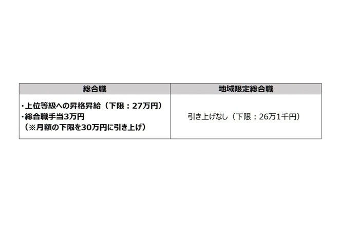 総合職に対しては、総合職手当として月額3万円を支給。給与の下限は30万円に増額されることになり、地域限定総合職の給与下限26.1万円と3.9万円の差を設ける。