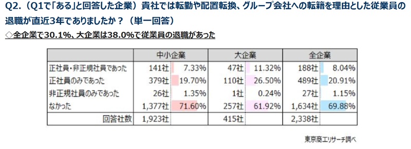 転勤や配置転換、転籍を理由とした退職が、正社員・非正規社員を問わず直近3年に「あった」と回答した企業が30.1%に達することが、このほど東京商工リサーチの調査でわかった。