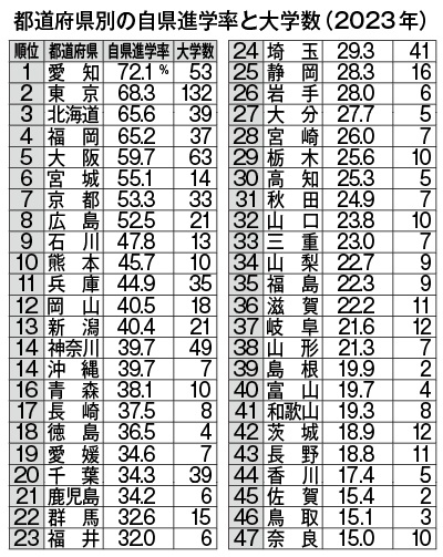 大学への自県進学率首位は愛知 東京・大阪抑え唯一の7割台