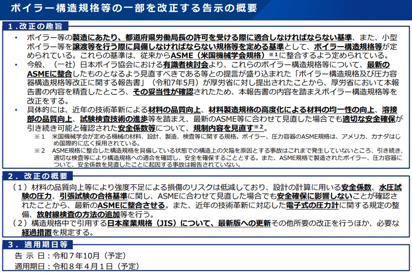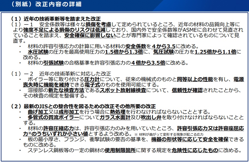 米国機械学会規格に整合させても、安全確保に影響しないと専門家が判断した。材料の安全係数を4から「3.5」とするほか、水圧試験の圧力を最高使用圧力の1.5倍から「1.3倍」、気圧試験の圧力を1.25倍から「1.1倍」へと緩和。またボイラーに取り付ける圧力計について一定の性能を持つ電子式の使用を認めるほか、溶接部の新たな検査方法にスポット放射線検査を追加する。