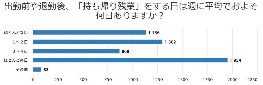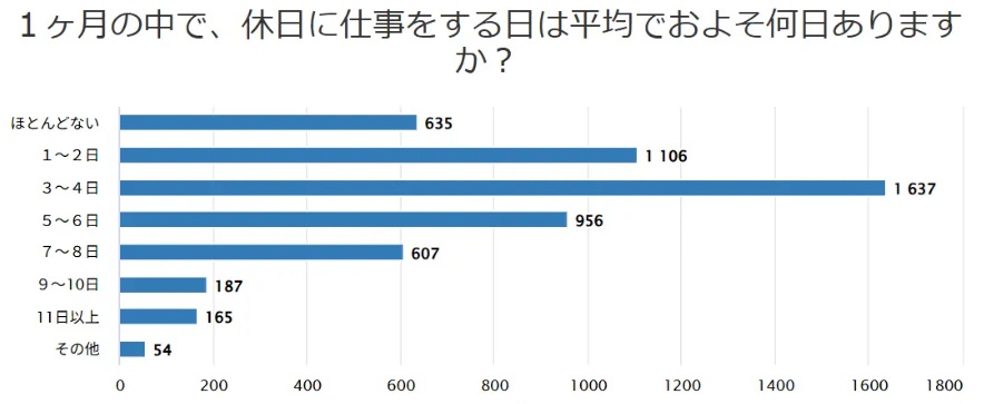また「持ち帰り残業をほとんど毎日する」が36.6%、「休日にも仕事をする」が87.1%となるなど過酷な勤務環境を浮き彫りにした。