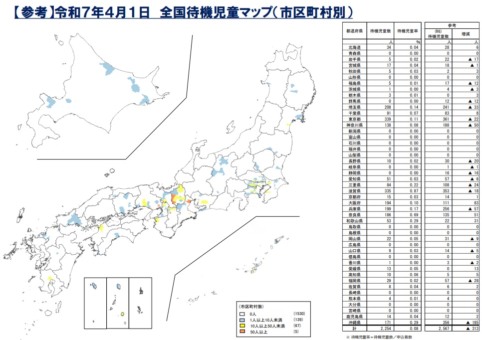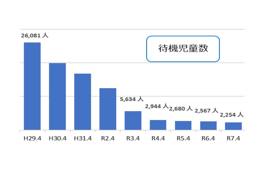 2025年4月1日時点の待機児童数が過去最少の2254人となり、前年比313人減と8年連続で改善したことが、こども家庭庁の調べでわかった。
