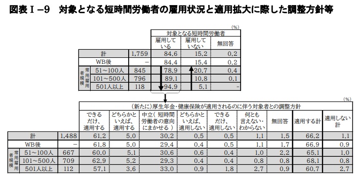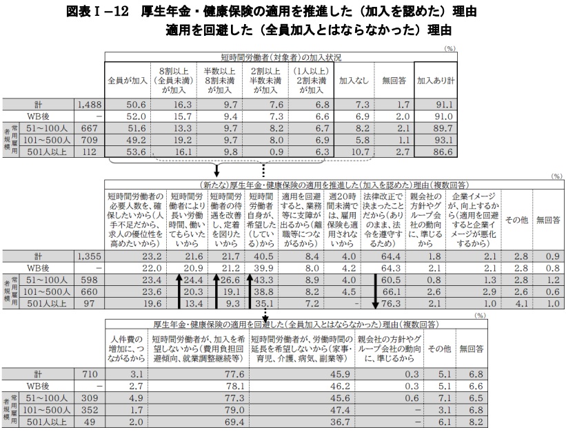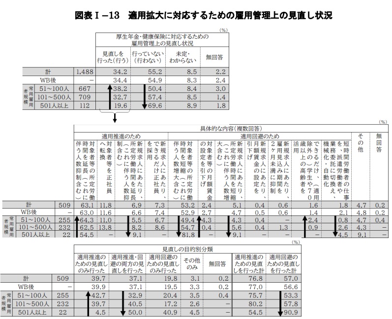 一方、適用拡大で38.2%が雇用管理を見直したが、具体的な内容は「所定労働時間の延長」が64.3%、「所定労働時間を短縮」が49.4%と多く、見直し目的は適用推進と適用回避でスタンスが分かれた。