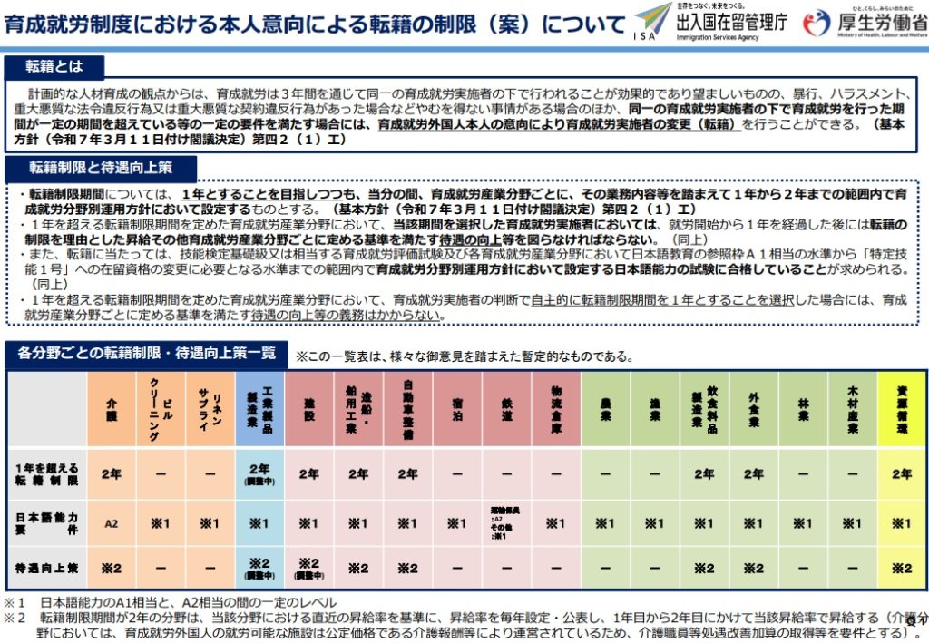 出入国在留管理庁と厚生労働省は、育成就労制度で新たに認める本人意向による転籍について、産業分野ごとの転籍制限期間の案を公表した。