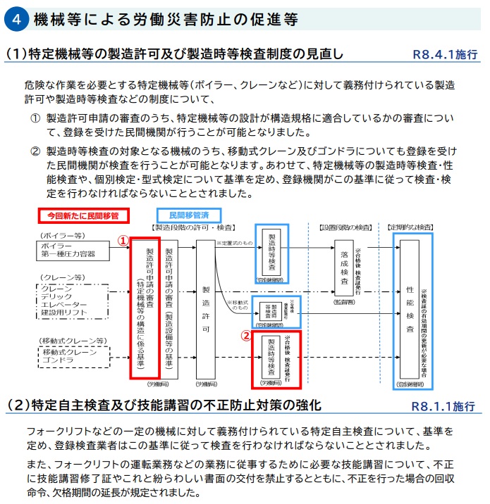 37条からの機械などに関する規制については、26年4月に37条3項を新設する。危険な作業を伴う機械や設備を指す特定機械等の製造の許可について、登録設計審査等機関が行った設計審査の結果を記載した書類の添付をして申請することを義務化。ただし、都道府県労働局長が申請された特定機械等の設計審査の業務を行う場合は除く。