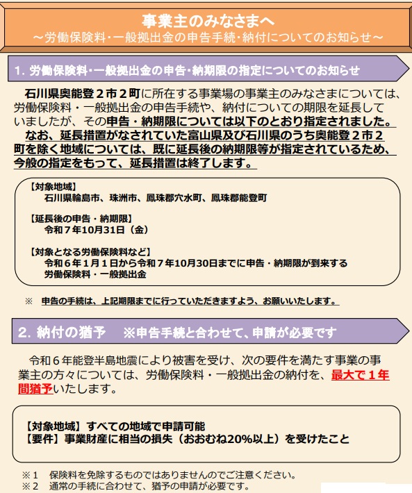 厚生労働省はこのほど、2024年能登半島地震の発生に伴い石川県奥能登2市2町で延長していた労働保険料などの申告・納期限を、今年10月31日に決定したと発表した。