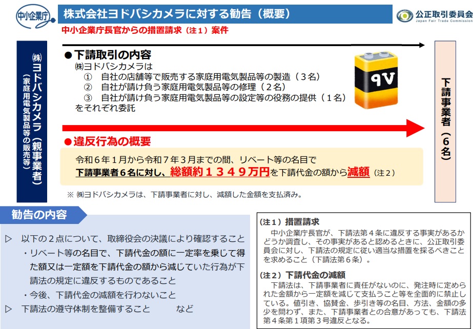 公正取引委員会はこのほど、下請代金支払遅延等防止法違反でヨドバシカメラ(東京都新宿区)に是正勧告した。