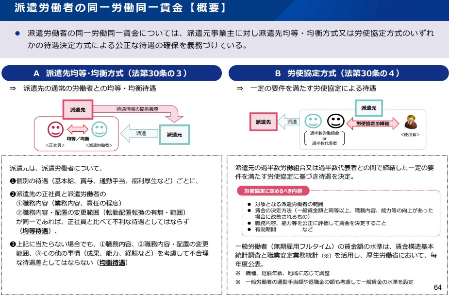 同一部会は派遣の待遇改善に向けて審議を重ねているが、均等・均衡待遇規定の見直しをめぐり労使の意見は平行線を辿る。使用者側委員が「両方式の間で満足度に大きな違いがない」「両方式ともに待遇改善が進んでいるのは明らか」だとして現行維持すべきと主張。これに対し、労側は「原則より例外の方式のほうの導入が圧倒的に多いのはおかしい」として改善を強く求めている。