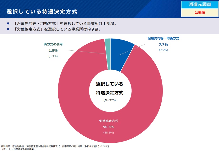 派遣賃金を決定する方法は、現行制度で2つの方式を整備。原則と位置づける派遣先均等・均衡方式と、あくまでも例外の協定方式だが、派遣元の導入割合は順に1割、9割とその差は大きい。