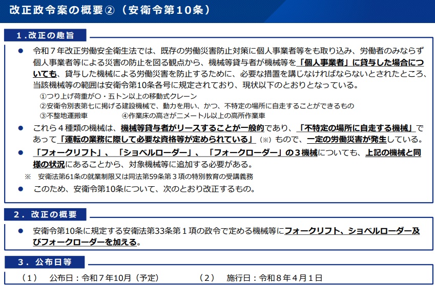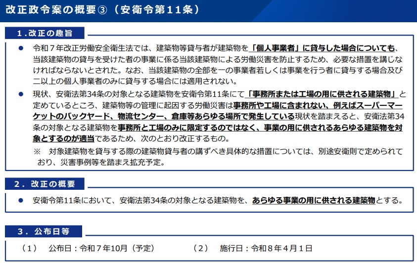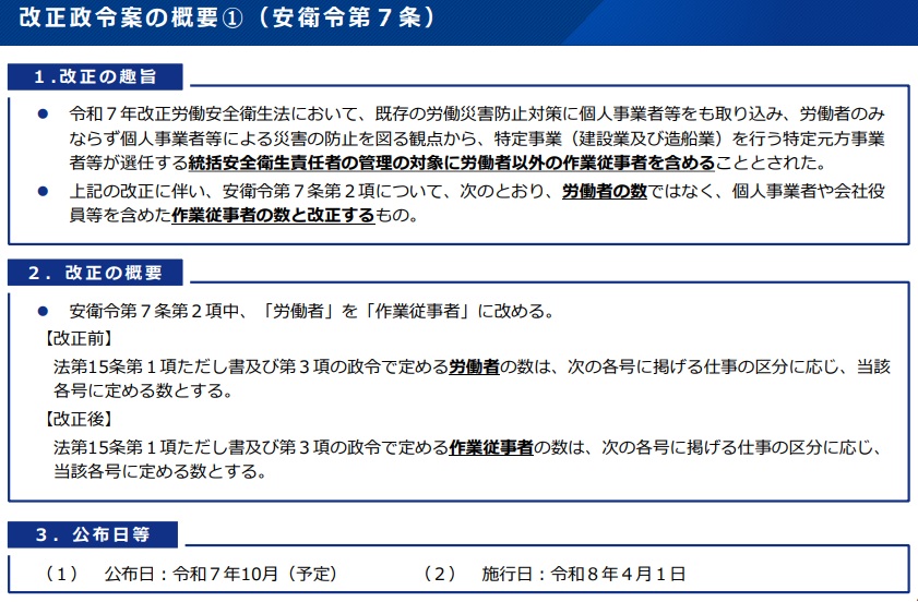安衛法改正による個人事業者の労働災害防止強化を受け、統括安全衛生責任者の選任義務が不要の事業場基準を、労働者から「作業従事者」の数へ変更。貸与者に義務づける災害防止措置の対象については、機械に「フォークリフト」「ショベルローダー」「フォークローダー」を追加し、建築物は「あらゆる事業の用に供される建築物」と示す。