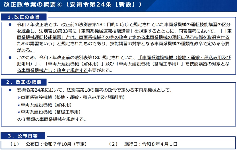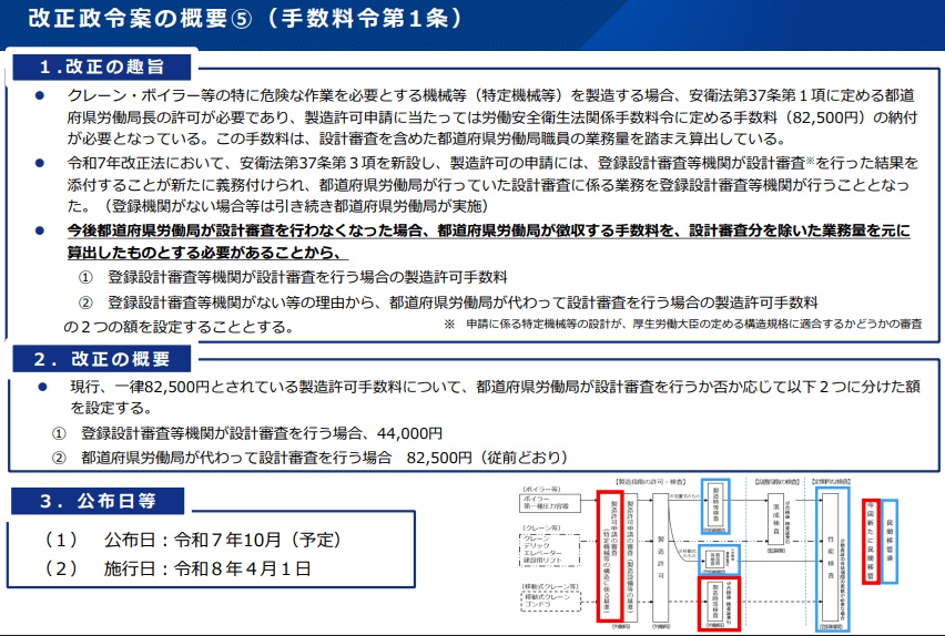一方、技能講習対象の車両系機械の種類も規定し、いずれも建設の「整地・運搬・積込み用、掘削用、解体用、基礎工事用」と列挙。このほか特定機械などの製造許可申請の手数料を、登録設計審査等機関が都道府県労働局に代わり設計審査する場合には、現行の8万2500円から4万4000円へ減額する。