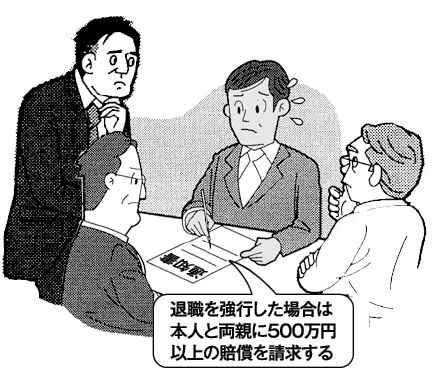 退職を強行した場合は原告や両親等に500万円の損害賠償を請求するとの「通知書」を提示。その受領書への署名を繰り返し求めたため、原告が登録している転職サービスのエージェントを呼んだり、110番通報する騒動に。原告は弁護士と再度出社する旨の約束をし、社員寮の鍵を返還して解放されますがその後は出社しませんでした。