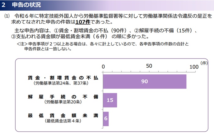 違反率を算定すると、76.4%と7割を大きく突破。また違反の是正を求める申告が107件と三桁の大台に乗り、重大・悪質な違反の送検は7件を数えるなど、特定技能外国人の就労環境の整備が遅れている実態が浮き彫りになった。