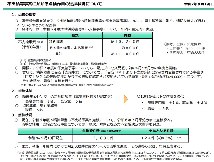 日本年金機構はこのほど、社会保障審議会に2024年度以降の障害年金の認定に関し、9月19日時点の精神障害の不支給事案の点検状況を報告した。